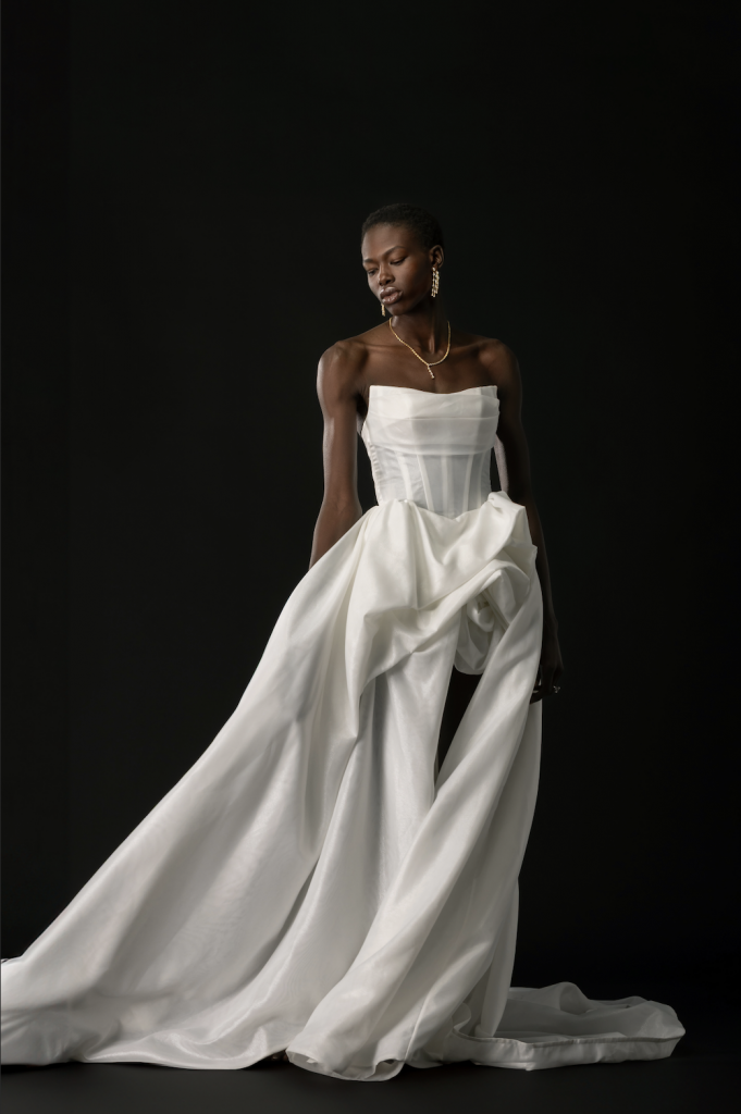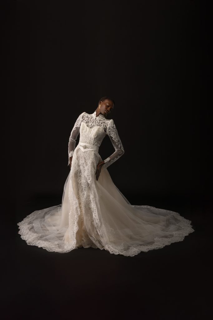 Lyra by Viero Bridal, $3,500, 506 S. Washington Ave., Royal Oak, 586-566-7800; 6.38CT 41 Pear Diamond 14KY Half Eternity Drop Necklace, $27,325; 4.05CT Round Lab-Grown Diamond 35 Round Lab-Grown Diamond Cut Down Pave Cathedral Ring, $8,200. Jewelry from Tapper’s, The Somerset Collection, Troy, 248-649-2000, tappers.com, thesomersetcollection.com.