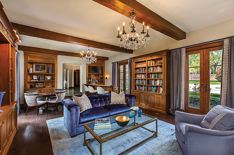 Over a year’s time, McGovern and her two associates turned what was a large, open living room with neutral colors into an intimate, luxe library and game room replete with a handmade bar, two crystal chandeliers, and gorgeous, inviting furnishings in shades of rich violet-blues (including a violet-blue sofa that McGovern describes as “clematis” in shade).