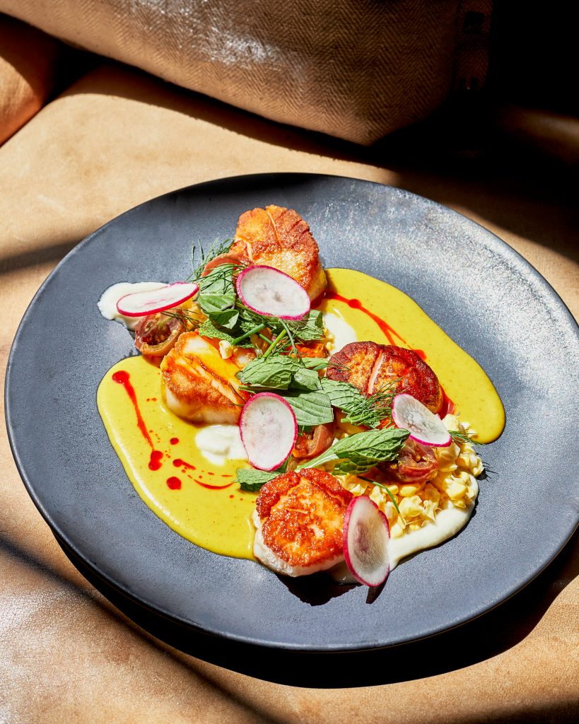 4. To assemble the dish, spread cantaloupe curry on a plate. Place the seared scallops on top and surround each with small piles of the blistered cherry tomatoes and fermented corn. Top with fresh-picked herbs such as basil, mint, fennel, dill, or chives. Drizzle with a small amount of annatto oil and serve.